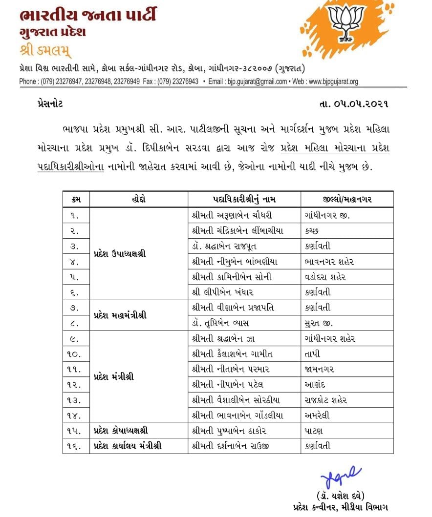 ગુજરાત પ્રદેશ ભાજપ પ્રમુખ પાટિલની સૂચના અને માર્ગદર્શન મુજબ ગુજરાત પ્રદેશ મહિલા મોરચાના પ્રમુખ ડૉ દિપીકા સરડવા દ્વારા પદાધિકારોની નિમૂક કરવામાં આવી છે જેમાં 6 ઉપાધ્યક્ષ, 2 મહામંત્રી , 6 મંત્રી અને કોષાધ્યક્ષ તથા પ્રદેશ કાર્યાલય મંત્રીની નિમણૂક કરવામાં આવી છે
