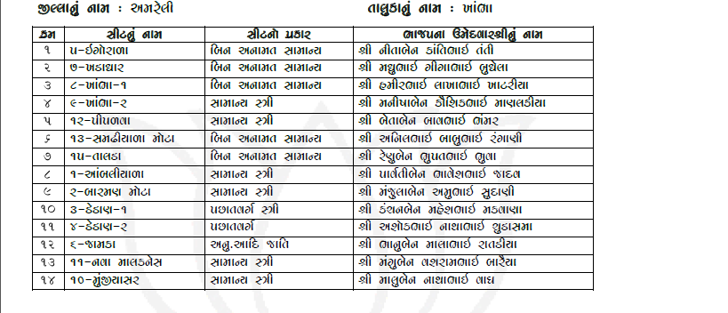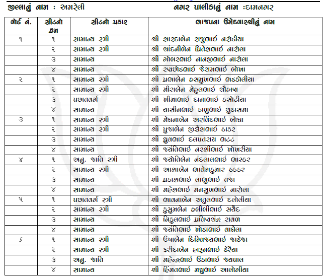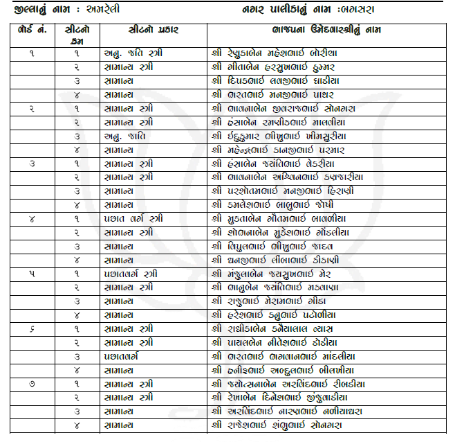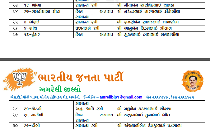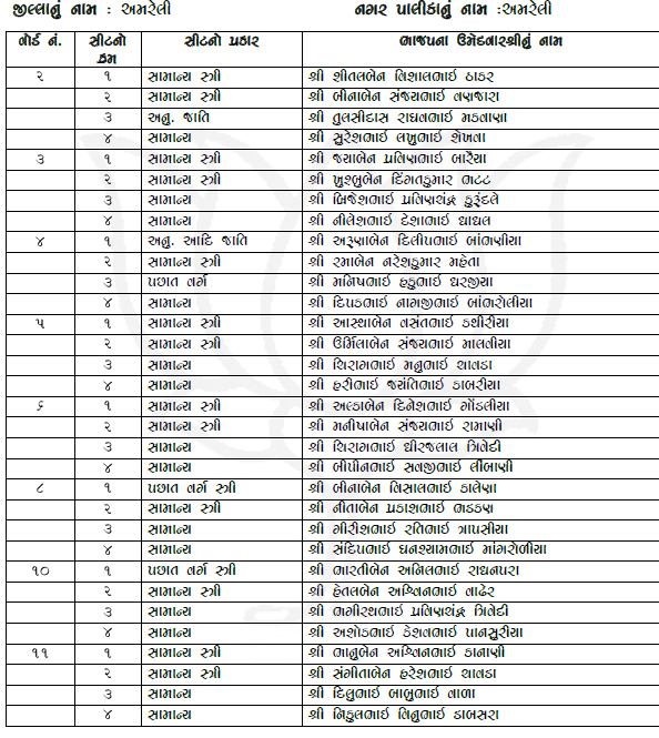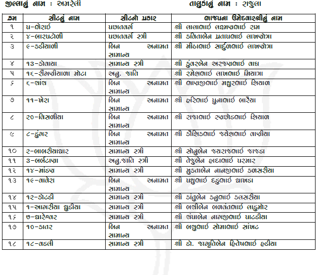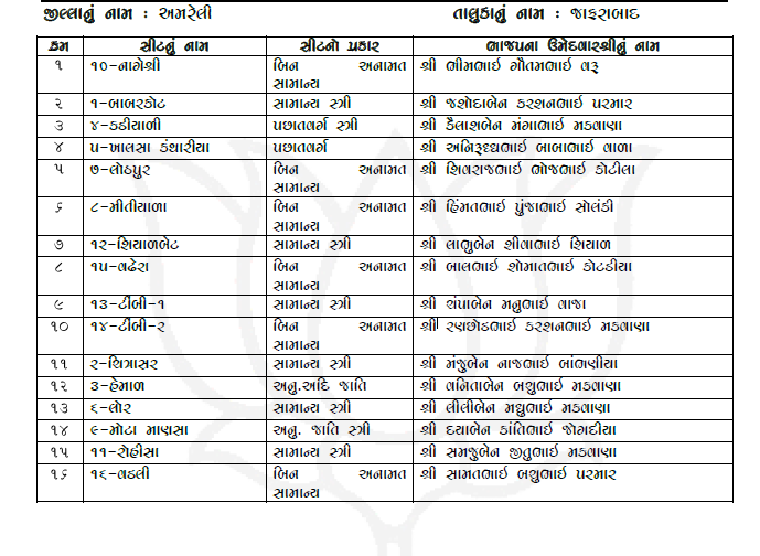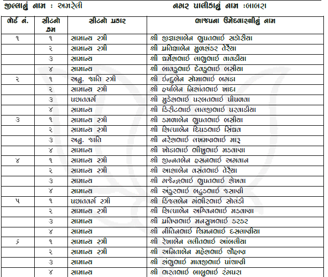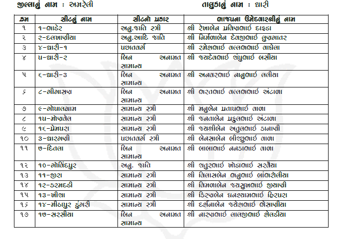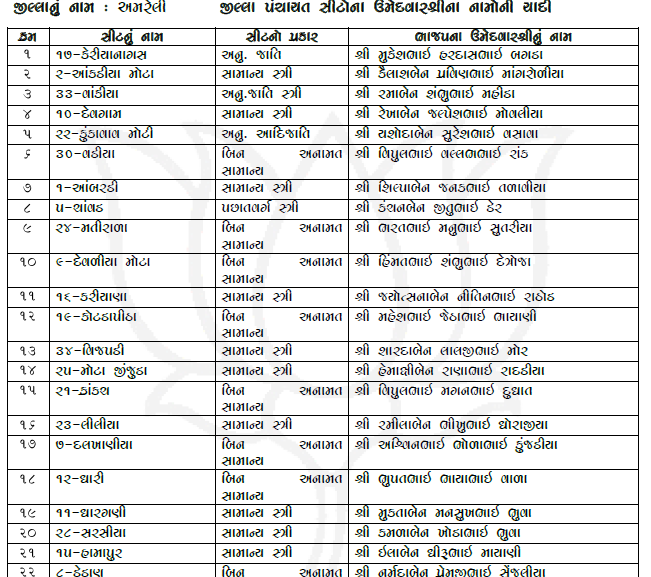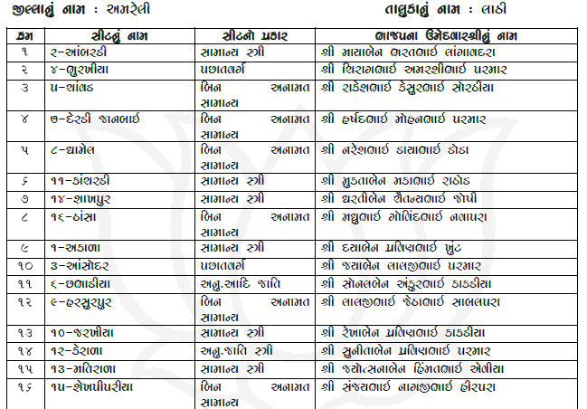 ગુજરાત પ્રદેશ ભાજપ પાર્લામેંટરી બોર્ડ દ્વારા અમરેલી જિલ્લા પંચાયત , અમરેલી જિલ્લા ની તાલુકા પંચાયત તેમજ 5 નાગર પાલિકાના ઉમેદવારો ની યાદી જાહેર કરવામાં આવી છે