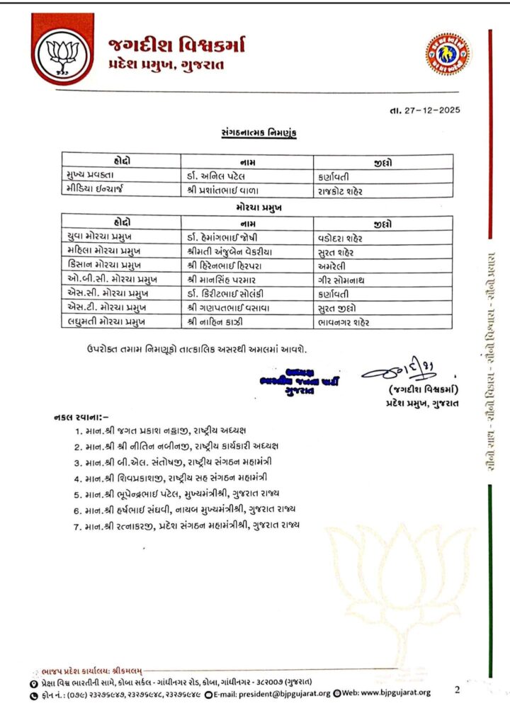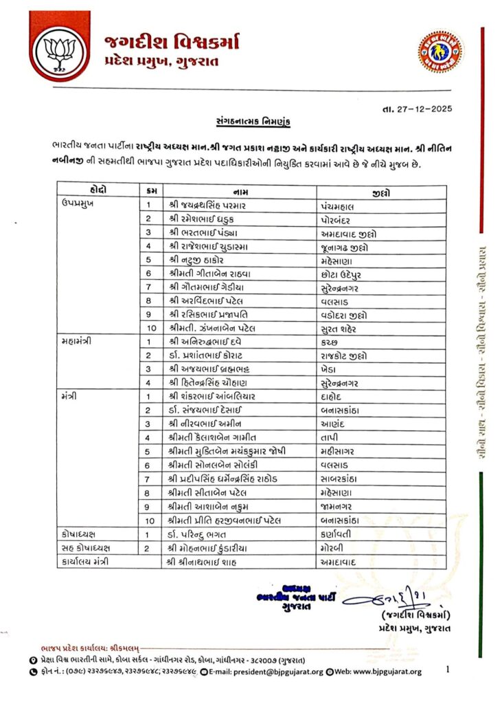 ગુજરાત ભાજપના પ્રમુખની જાહેરાત બાદ છેલ્લા ઘણા સમયથી સંગઠનના માળખાની ચર્ચાઓ ચાલી રહી હતી. અનેક અટકળો બાદ આજે સત્તાવાર ગુજરાત પ્રદેશ ભાજપનું સંગઠનું માળખું જાહેર કરવામાં આવ્યું છે . જેમાં 10 ઉપાધ્યયક્ષ, 4 મહામંત્રી અને 10 મંત્રી જાહેર કરવામાં આવ્યા છે.