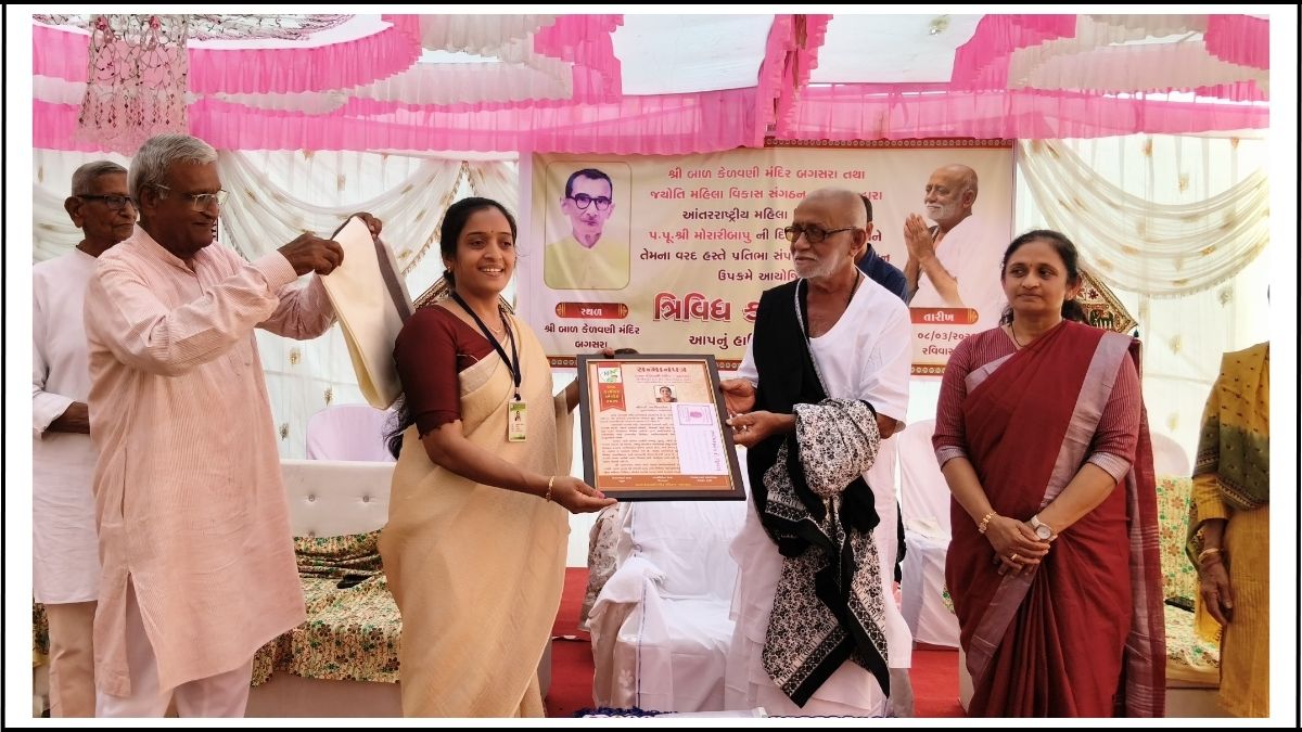 આંતરરાષ્ટ્રીય મહિલા દિન પ્રસંગે પ.પૂ.શ્રી મોરારીબાપુની દિવ્ય ઉપસ્થિતી અને સ્વહસ્તે પ્રતિભા સંપન્ન મહિલા સન્માન શ્રી બાળ કેળવણી મંદિર બગસરા તથા જયોતિ મહિલા વિકાસ સંગઠન બગસરાના સંયુકત ઉપક્રમે આયોજિત ત્રિવિધ કાર્યક્રમનું આયોજન કરવમાં આવ્યું હતું. જેમાં બાળ કેળવણી મંદિર બગસરા દ્વારા શ્રેષ્ઠ મહિલા કાર્યકરનું સેવા સન્માન તથા જયોતિ મહિલા વિકાસ સંગઠન બગસરા દ્વારા જયોતિ નારી રત્ન એવોર્ડ એનાયત તથા મહિલા સંમેલનનું આયોજન કરવામાં આવેલ છે.