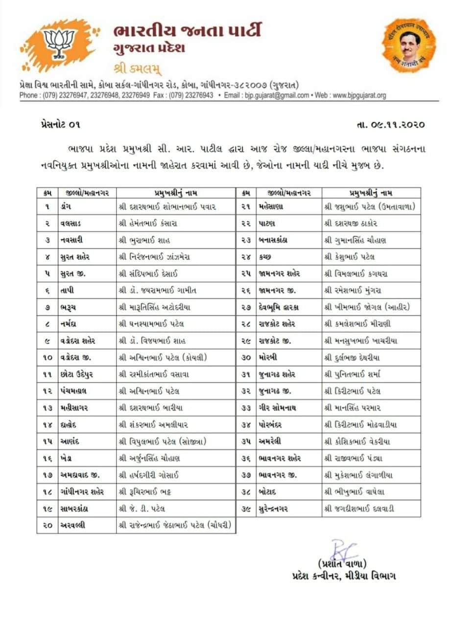 ભાજપ ના નવનિયુક્ત પ્રમુખ સી. આર. પાટીલ હાલ દિલ્હીમાં છે ત્યારે પેટાચૂંટણીના પરિણામની પૂર્વસંધ્યાએ ભાજપ સંગઠનમાં ફેરફાર અને નિમણૂક આજે શરૂ કરી દેવામાં આવી છે. જેમાં રાજ્યના તમામ જિલ્લા અને મોટા શહેરોના શહેર પ્રમુખોની જાહેરાત કરવામાં આવી છે. ભાજપ દ્વારા કુલ 39 પ્રમુખોની જાહેરાત કરવામાં આવી છે. નો રિપીટ થીયરી અંતર્ગત પાટીલ દ્વારા ટીમ જાહેર કરવામાં આવી છે.