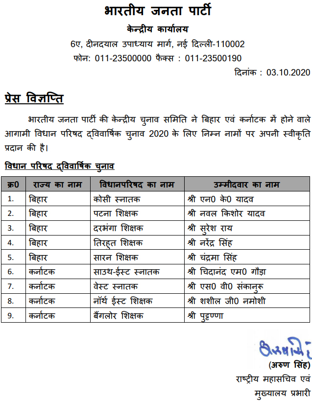 આગામી 28 ઓક્ટોમ્બર થી શરૂ થનાર વિધાનસભા ની ચૂંટણી માટે ભાજપ દ્વારા કુલ 9 ઉમેદવારોની સત્તાવાર જાહેરાત કરવામાં આવી છે. જેમાં બિહાર વિધાનસભા ના 5 ઉમેદવારો ના નામ જાહેર જાહેર કરવામાં આવ્યા છે જ્યારે 4 કર્ણાટક વિધાનસભા ના ઉમેદવારો નામ જાહેર કરવામાં આવ્યા છે.