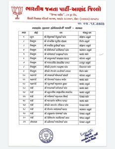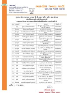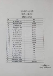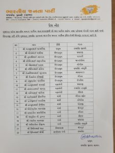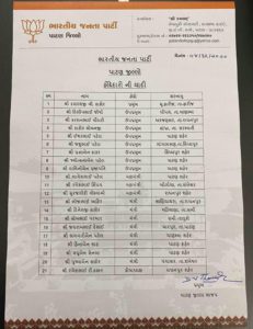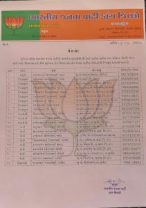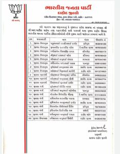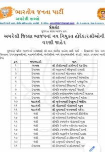 ગુજરાત ભાજપ પ્રદેશ અધ્યક્ષ સી.આર.પાટિલ ની નવી ટીમ તૈયાર થઈ રહી છે ત્યારે આજે વિવિધ જિલ્લાના અને ગ્રામ્ય સંગઠન અધ્યક્ષની યાદી પણ જાહેર કરવામાં આવી છે જેમાં રાજકોટ, દેવભૂમિ દ્વારકા, જામનગર , આણંદ, વડોદરા,જૂનાગઢ, દાહોદ,ડાંગ, ખેડા, કચ્છ, પાટણ, પોરબંદર અને અમરેલી જિલ્લા ના હોદેદારો ની વરણી કરવામાં આવી છે
