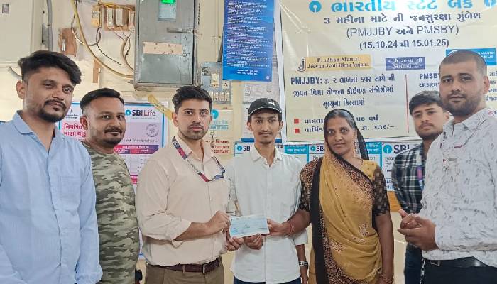 ત્યારે દલખાણીયા ના બ્રાન્ચ મેનેજર સૌરભ સિંહા અને સ્ટાફ તેમજ જનરલ ઇન્સ્યોરન્સ માં ફરજ બજાવતા હર્ષ કિશોરભાઈ સંઘાણી દ્વારા દિનેશભાઈ ના પત્ની 20 લાખ રૂપિયા નો ચેક ફાળવવામાં આવ્યો.