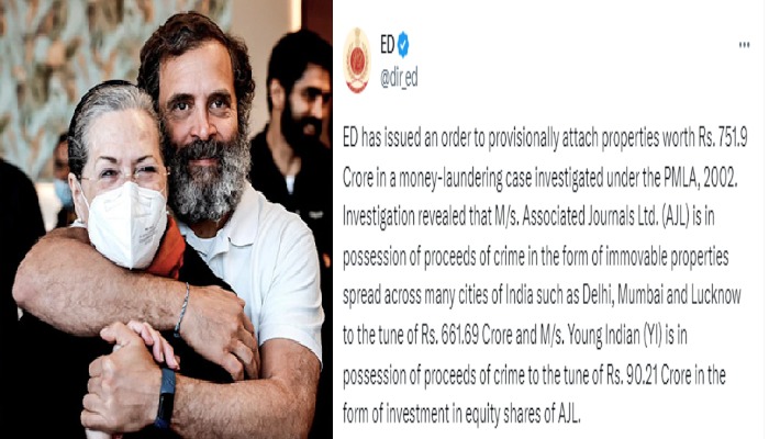 એજન્સી આ મામલે સોનિયા અને રાહુલ ગાંધીની પૂછપરછ કરી ચૂકી છે. સેન્ટ્રલ ઇન્વેસ્ટિગેશન એજન્સીએ કહ્યું કે જપ્ત કરાયેલી સંપત્તિઓમાં એજીએલની દિલ્હી, મુંબઈ અને લખનૌ સહિત ઘણી જગ્યાએ મિલકતો છે. તેની કુલ કિંમત 661.69 કરોડ રૂપિયા છે. EDએ કહ્યું કે યંગ ઈન્ડિયાની પ્રોપર્ટીની કિંમત 90.21 કરોડ રૂપિયા છે.