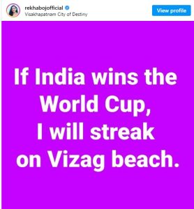 રેખાએ ઈન્સ્ટાગ્રામ અને ફેસબુક પર પોસ્ટ શેર કરી છે. જેમાં લખ્યું હતું કે, ‘જો ભારત વર્લ્ડ કપ જીતશે તો હું વિઝાગ બીચ પર સ્ટ્રીક કરીશ. ઓલ ધ બેસ્ટ અમારી ટીમ ઈન્ડિયા. સ્ટ્રેકિંગ એક પ્રથા છે જે સામાન્ય રીતે વિદેશોમાં જોવા મળે છે. આ અંતર્ગત જો કોઈ રમતમાં મોટી જીત થાય છે, તો ઉજવણી કરવા માટે કપડા વિના રેસ ચલાવવામાં આવે છે.