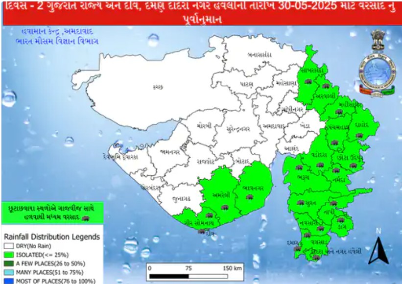 રાજ્યમાં જૂન મહિનામાં મેઘરાજા ધબધબાટી બોલાવશે પણ એ પહેલા હવામાન વિભાગની આગાહી પ્રમાણે આજથી વરસાદની ગતિ ધીમી પડશે. 30 મેથી લઈને આગામી 5 દિવસ માછીમારોને દરિયો ન ખેડવા સૂચના આપવામાં આવી છે.હવામાન વિભાગે આગામી 7 દિવસને લઈને આગાહી કરી છે. રાજ્ય તરફ વરસાદ આપતી બે વરસાદી સિસ્ટમ, જેમાં વરસાદી ટ્રફલાઇન પસાર થતી હોવાથી અને અપર એર સાઇક્લોનિક સર્ક્યુલેશન સિસ્ટમ સક્રિય થવાથી વરસાદની આગાહી કરવામાં આવી છે,