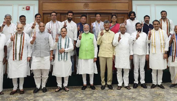 બુધવારે પીએમના નિવાસસ્થાને એનડીએની બેઠકમાં તમામ ઘટક પક્ષોના નેતાઓ સામેલ થયા હતા, જે લગભગ એક કલાક સુધી ચાલેલી બેઠકમાં પીએમ નરેન્દ્ર મોદીને ફરી એકવાર એનડીએના નેતા તરીકે પસંદ કરવામાં આવ્યા હતા. બેઠકમાં ભાગ લેનારા તમામ ઘટક પક્ષોએ ભાજપ અધ્યક્ષ જેપી નડ્ડાને તેમના સમર્થનના પત્રો પણ સુપરત કર્યા હતા.