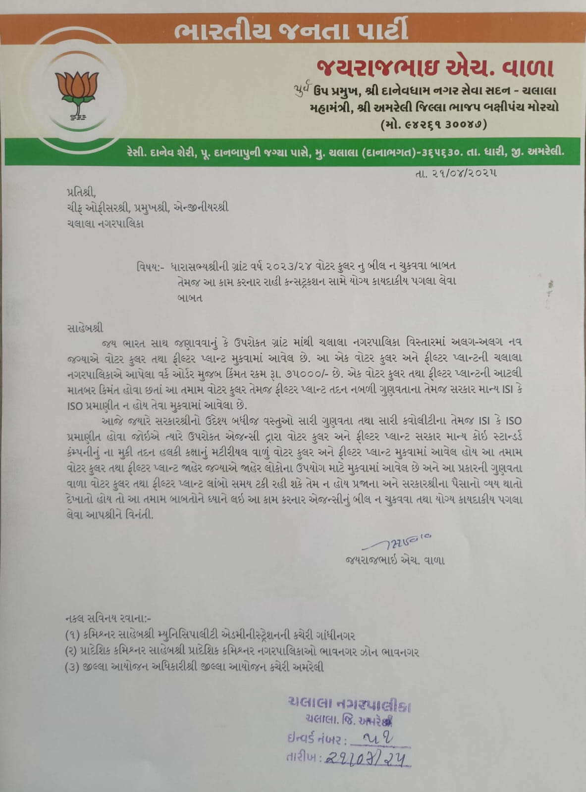 પ્રકાશ કારીયા-ચલાલા/ ધારાસભ્ય જે.વી.કાકડીયા ના હોમટાઉન ચલાલા નગર પાલીકા મા ધારાસભ્ય જે.વી.કાકડીયા ની ગ્રાન્ટ મા થીજ ખરીદ કરાયેલ વોટરકુલર (Ro સીસ્ટમ સાથેના) મા ધારાસભ્ય જે.વી. કાકડીયા ની મીઠી નજર તળે નગરપાલીકા ના સત્તાધીશો, ચિફ ઓફિસર, અને એન્જીનયર ની મીલીભગત થી મસ મોટો ભષ્ટાચાર થવા હોવાનો આક્ષેપ કરી યોગ્ય તપાસ કરવાની માંગણી ચલાલા નગર પાલીકા ના પુર્વ ઉપ પ્રમુખ અને જાગૃત સદસ્ય જયરાજભાઈ વાળા અને જાગૃત અને લોકપ્રિય સદસ્ય પરેશભાઇ કાથરોટીયા એ ઉગ્ર લેખીત મા માંગણી કરતા નગર પાલીકા મા હડકંપ મચી ગયો છે..સદસ્યશ્રીઓ એ જણાવ્યા મુજબ ચલાલા શહેર ના જુદા વિસ્તારો મા ધારાસભ્ય ની ગ્રાન્ટ માથી વોટરકુલર (Ro) મુકવામા આવેલ છે.