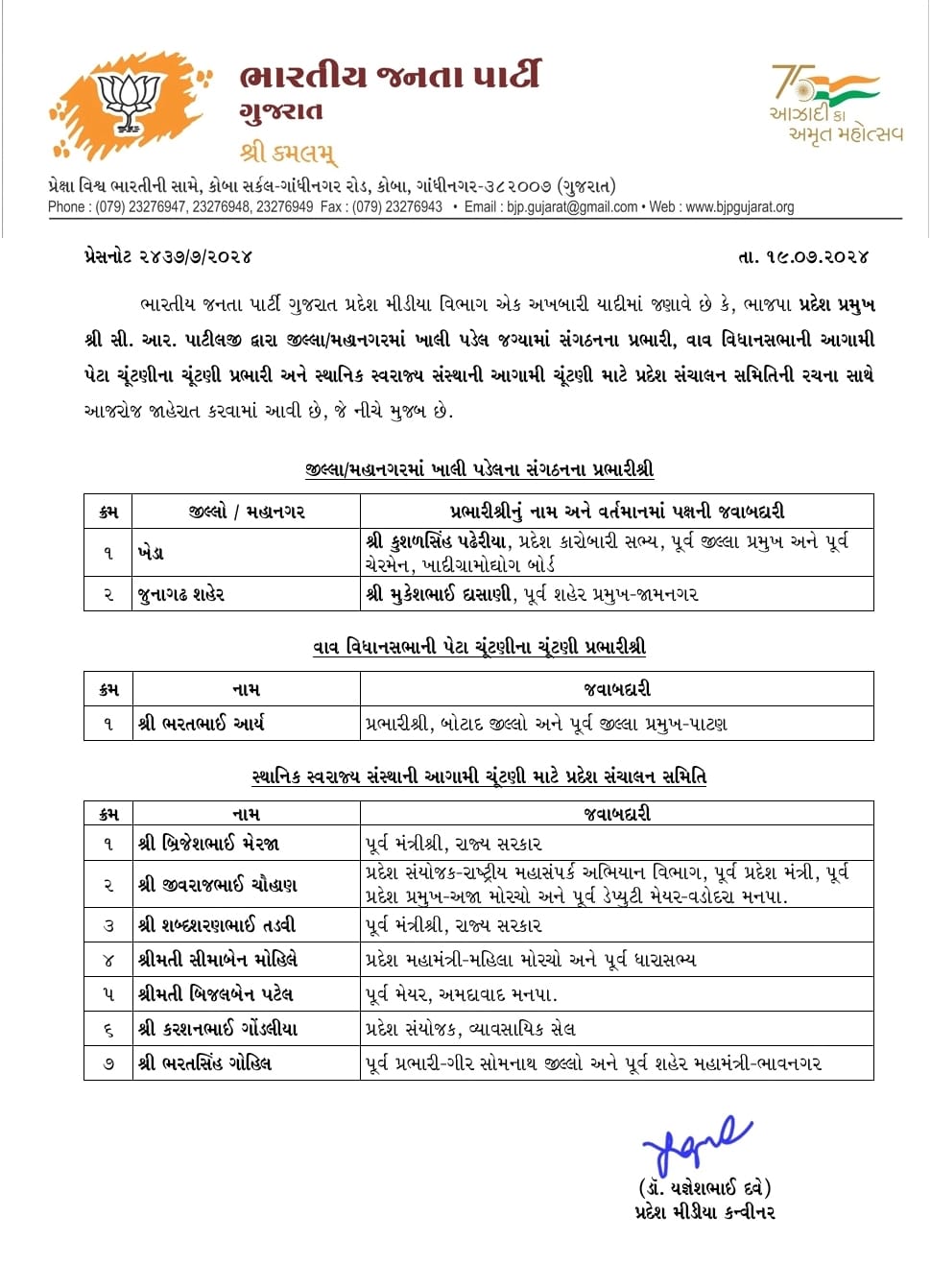 આ નેતાઓને સોંપવામાં આવી જવાબદારી